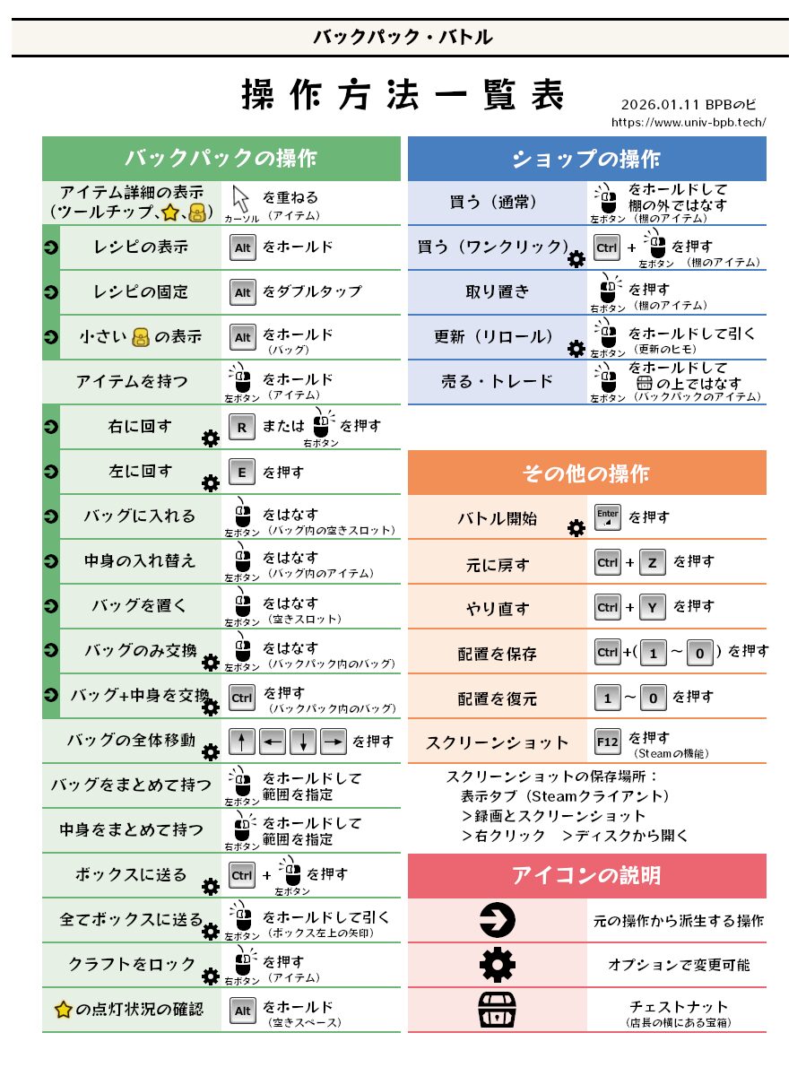トップページ 2023.11.122026.01.11 Steam Store バックパック・バトル 同ページ内にデモ(無料)版あり リリース日:2025.06.14 開発元:PlayWithFurcifer 価格:1,900円 ジャンル:オートバトル 対応機種:Windows,Linux ●新着情報 バックパック・バトルのモバイル版が近日リリース!! 2026.01.10 パッチノート ver1.0.9b 2025.12.05 パッチノート ver1.0.9 2025.11.15 パッチノート ver1.0.8 2025.09.26 パッチノート ver1.0.7 2025.09.212025.12.05 ver1.0.7 パッチノート 2025.08.22 ver1.0.6 パッチノート 2025.07.26 ver1.0.5 パッチノート 2025.07.19 ver1.0.4 パッチノート 2025.07.12 ver1.0.3 パッチノート 2025.07.05 >>旧ページ