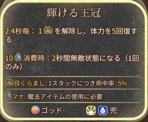 2秒間の無敵が強力な対策アイテム。無敵のタイミングが早すぎても遅すぎても良くないので、獲得のスピード調整が大切。の獲得量が多い場合は、輝ける王冠を複数買って発動することも可能。クラフト先のアイテムも強力なものがそろっている。