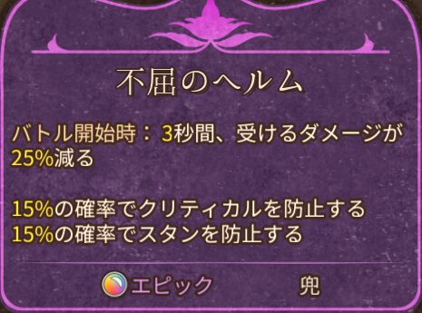 不屈のヘルムは開始3秒間のダメージを割合で減少させるという効果のため、相手から受けるダメージが低いラウンド2では、不屈のヘルムで防げるダメージが非常に低いです。また、相手からクリティカルやスタンを受ける可能性も低いです。クラフトして作れる苦痛のヘルムは強力なため将来性はありますが、現時点での弱さのほうが目立ちます。