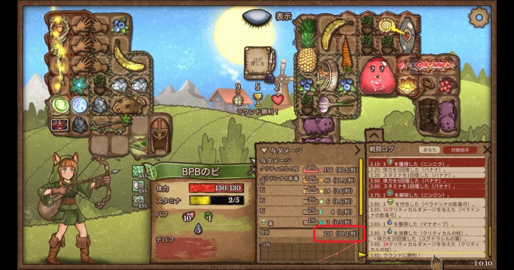 戦闘ログをスクロールして最終行を選ぶとそのラウンドのDPS(1秒当たりのダメージ)がわかるので、活用してみてください。