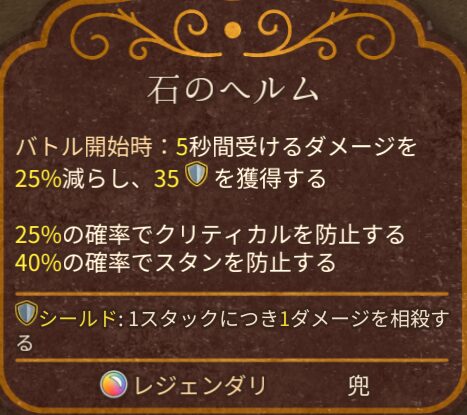 時間が進むほど強くなる構成の場合であれば、速攻型に落とされないようにクリティカルやスタンを防止できる石のヘルムがより有効になりやすいです。