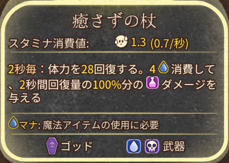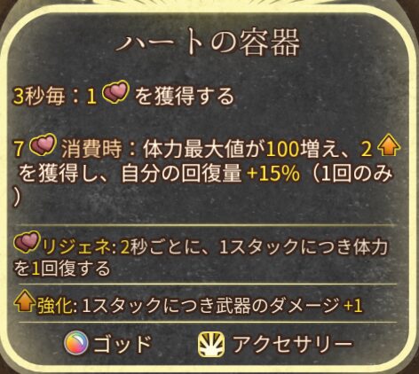 癒やさずの杖は回復によってダメージも与える武器のため、相手に回復量を下げる対策をされると回復もダメージも下がるため非常に厳しくなります。このため、ハートの容器が持っている回復量を上げる効果は自分の強みを守るために大切です。