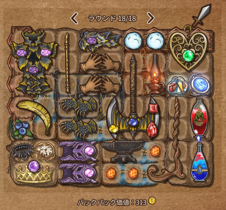 ラウンド1~4でオノを買うだけでかなとこに確定して良い。ラウンド5~7はレアが出やすいため、積極的にリロールすれば高い確率で2本目のオノを買ってダブルアックスをクラフトできる。同じレア帯のコアアイテムである富の宝箱も合わせて買いやすい。