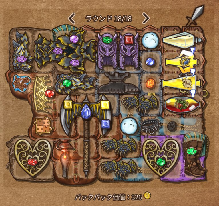 ラウンド1~4でオノを買うだけでかなとこに確定して良い。ラウンド5~7はレアが出やすいため、積極的にリロールすれば高い確率で2本目のオノを買ってダブルアックスをクラフトできる。同じレア帯のコアアイテムである富の宝箱も合わせて買いやすい。