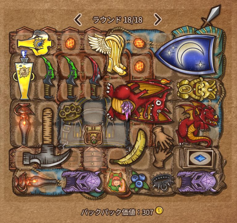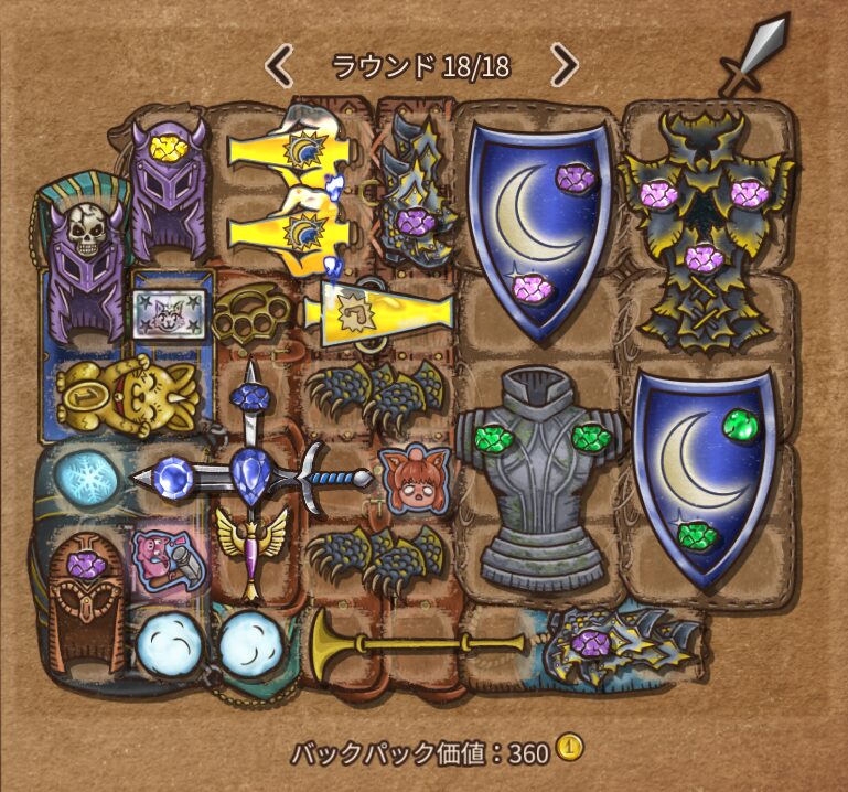 迅速のグローブ、富の宝箱、革の鎧、硬肌のポーション、不屈のヘルム、堕落のクリスタル、マナオーブ、勇気の盾、血のアミュレット、招きネコ