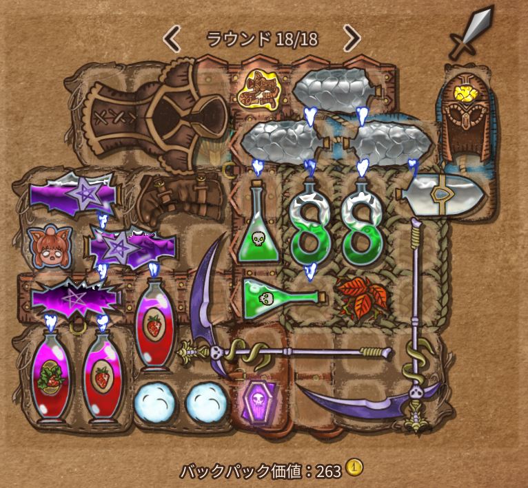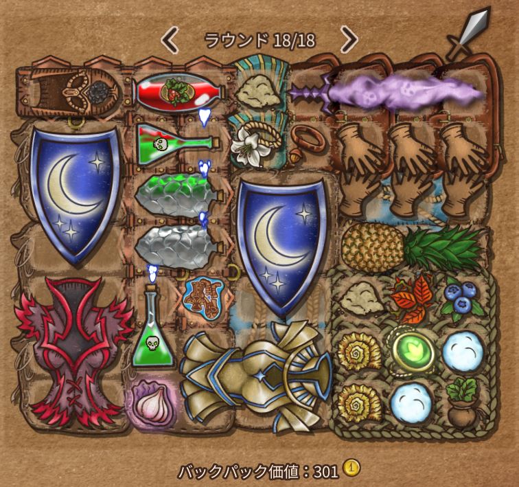 臭い立つ防壁を買った時点でかなりドクウルシ寄り。ただし、ドクウルシに確定するほどではない。ニンニクを集めながら、ラウンド3以降のアイテムの寄り方によって進行を考える。