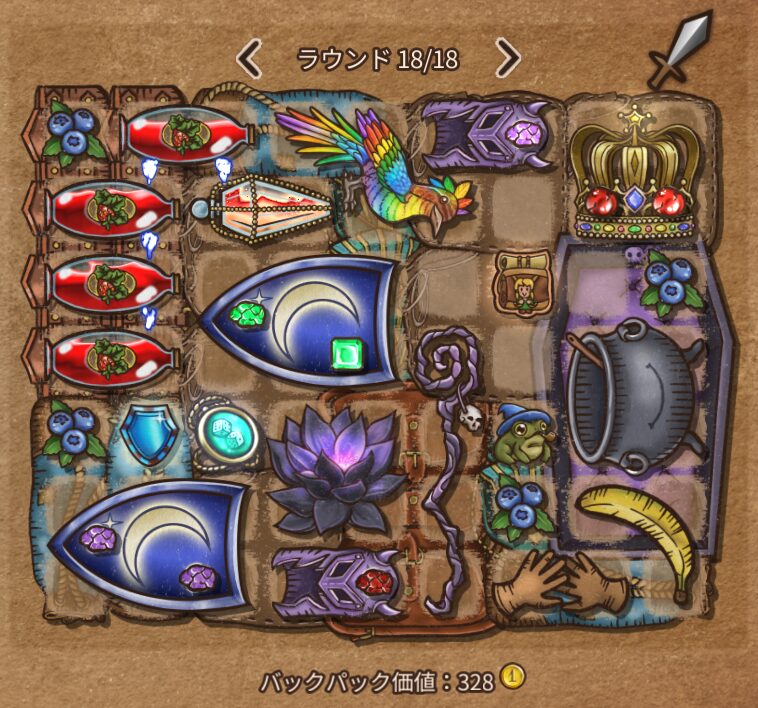 ヘルスポーション、ブルーベリー、迅速のグローブ、富の宝箱、ショップ会員カード、マナオーブ、幸運泥棒のアリスイ、プリズムオーブ、悪鬼のフラスコ、輝ける王冠、ハートの容器