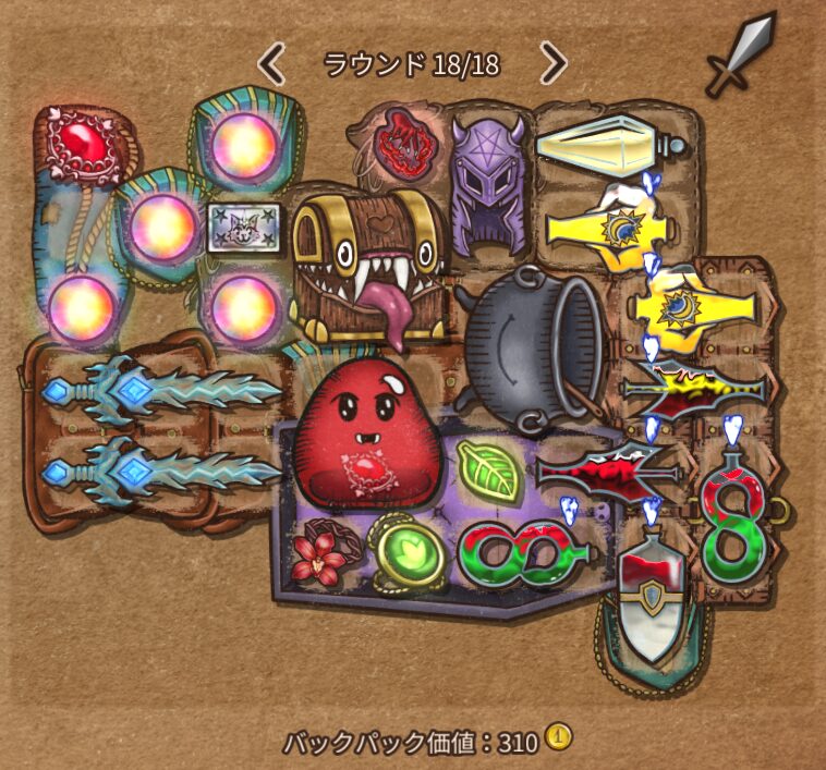 飢えたる剣を買った段階で夜闇のヘアコームか大ナベを狙う進行になる。血のアミュレットがないとラウンド8以降が厳しいので、血のアミュレットを買えるタイミングで初めて大ナベを検討する。