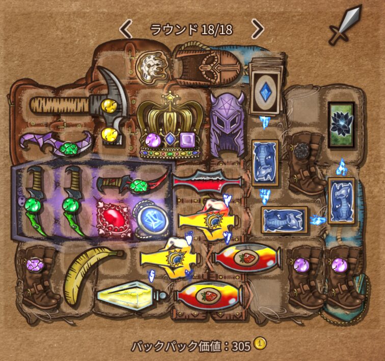 ハンマー、バナナ、ブタちゃん貯金箱、ダガー、カードデッキ、富の宝箱、ヘルスポーション、疫毒のフラスコ、革のブーツ、血のアミュレット、ヒーローポーション、ルビーエッグ