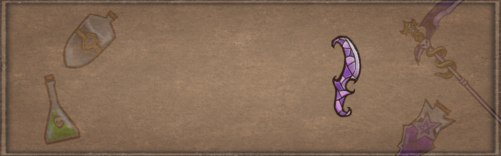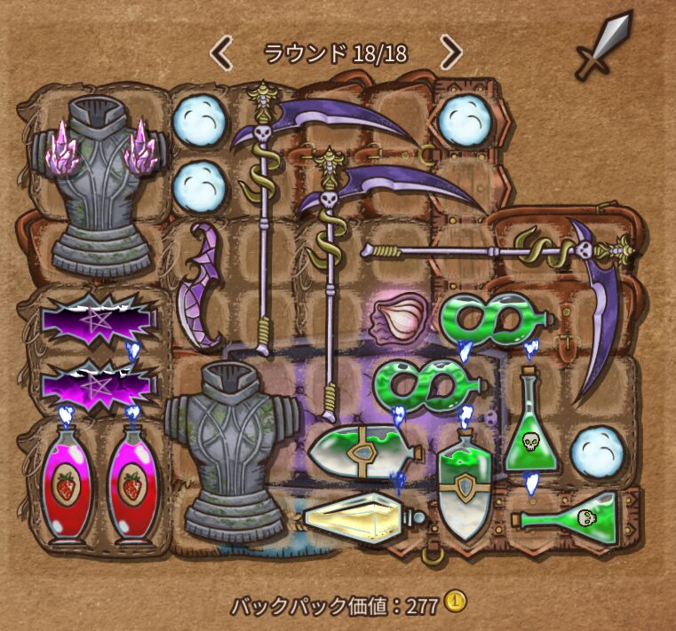 ヘルスポーション、革の鎧、ショップ会員カード、ベニテングダケ、疫毒のフラスコ、硬肌のポーション、堕落のクリスタル、死神の鎌、悪鬼のフラスコ、(ニンニク)