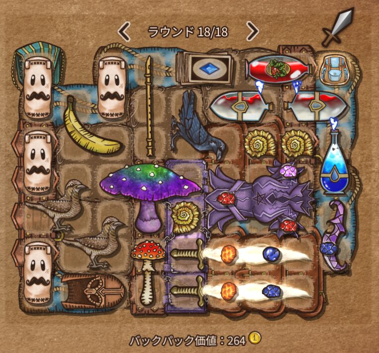 なお、序盤のハンマーの強さとブタちゃん貯金箱を割る金策で有利を取る構成なので、ラウンド3以降にハンマーを買うのは良い進行とは言い難い。